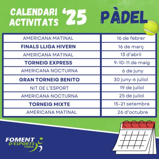 Ja tenim el calendari d’activitats de la secció de pàdel durant tot l’any 2025. Hi ha una mica de tot: americanes, grans tornejos, torneig exprés, finals de la lliga d’hivern, participació a la Nit de l’Esport… Ja et pots reservar les dates que més t’agradin.